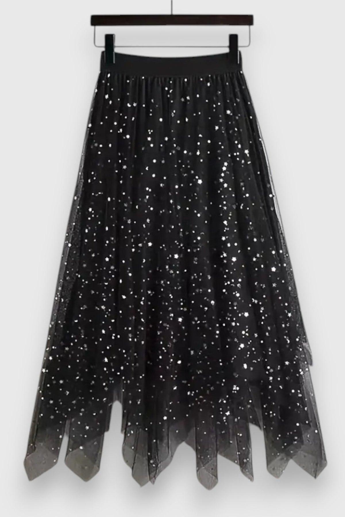 Sofistikacija su drąsia blizgesiu. Kolette sijonas išsiskiria savo figūrą glostančiu kirpimu ir blizgiais akcentais, kurie pakelia bet kokį drabužį. Jo iškirpta apatinė dalis suteikia judesio, o blizgantys blizgučiai sukuria žavingą ir moterišką kontrastą. Universalus drabužis, kuris sujungia prabangą su kasdieniu stiliumi.