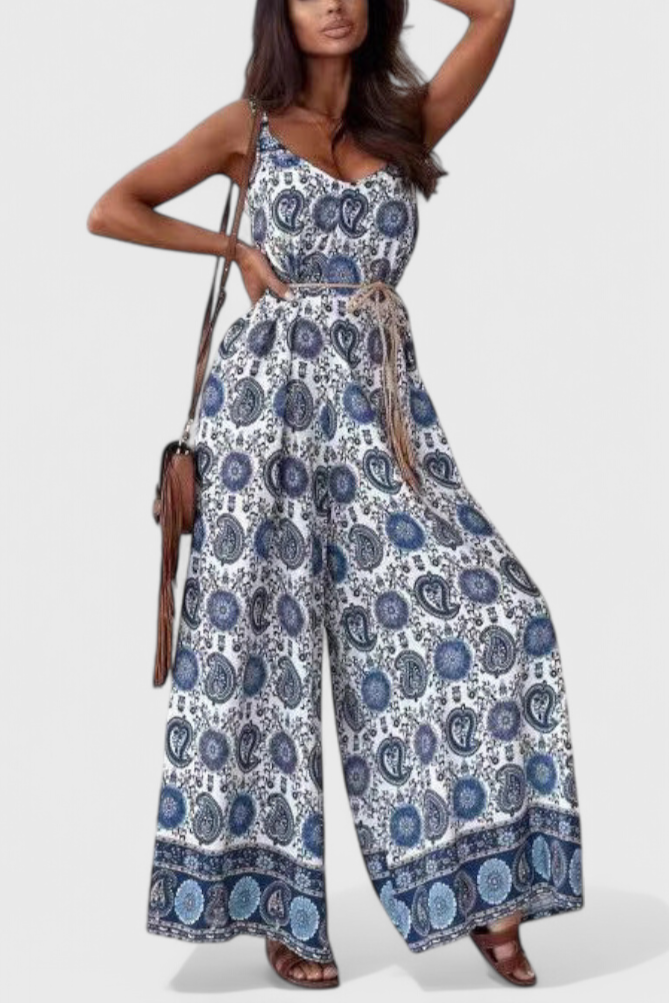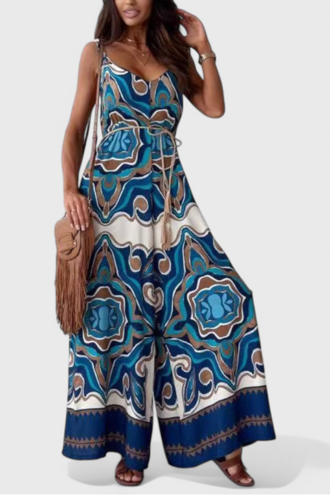 Pasiekite įspūdingą įėjimą su Gabriella: laisvai krintantis platių kojų kombinezonas, sukurtas pritraukti dėmesį. Su savo palankiu V formos iškirpimu, subtiliomis spaghetti petnešėlėmis ir juosta, akcentuojančia liemenį, šis įvaizdis sujungia drąsų raštą su lengvumu. Puikiai tinka saulėtoms atostogoms ar elegantiškiems vakariniams planams.