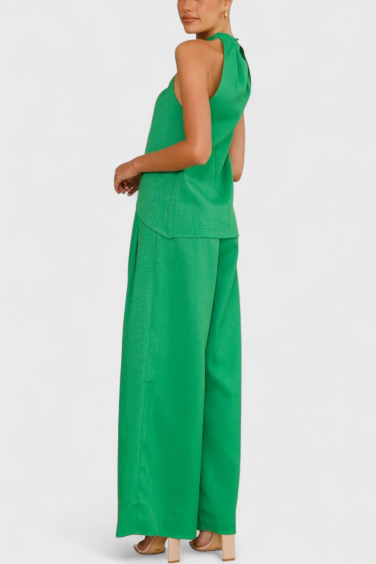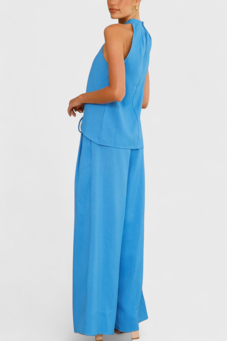 Estruturado frescor com uma atmosfera relaxada e sofisticada. O conjunto Bernadina combina um top sem mangas com abertura frontal e gola alta, além de calças largas com cinto na cintura. A sua mistura de linho proporciona leveza natural, ideal para climas quentes e momentos de lazer com estilo.