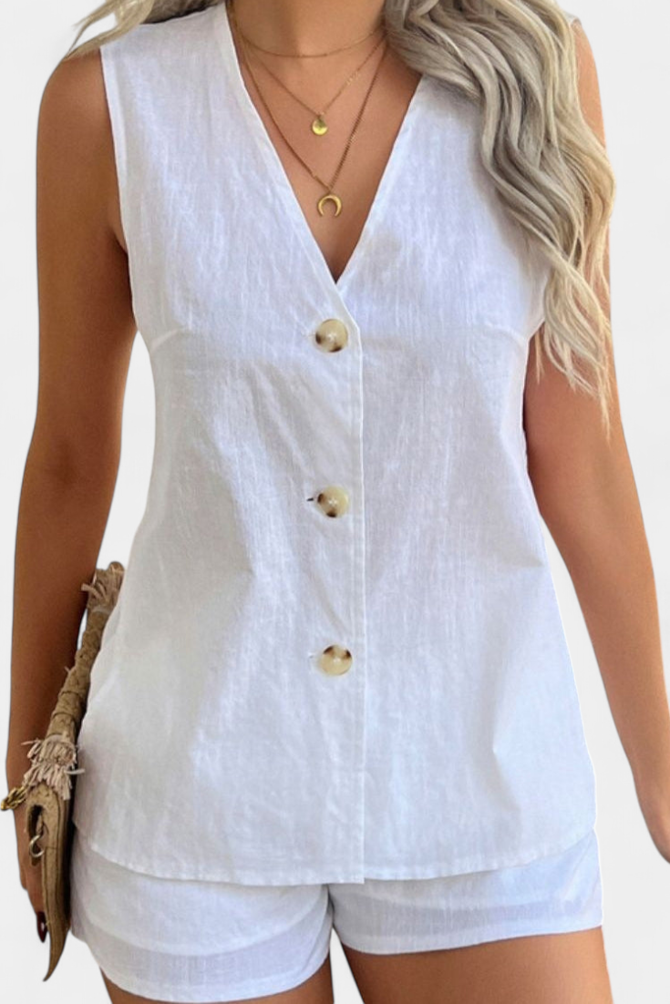 - Bezmuguru marškiniai su V formos iškirpte ir mygtukais, kad gautumėte struktūruotą ir švarų vaizdą