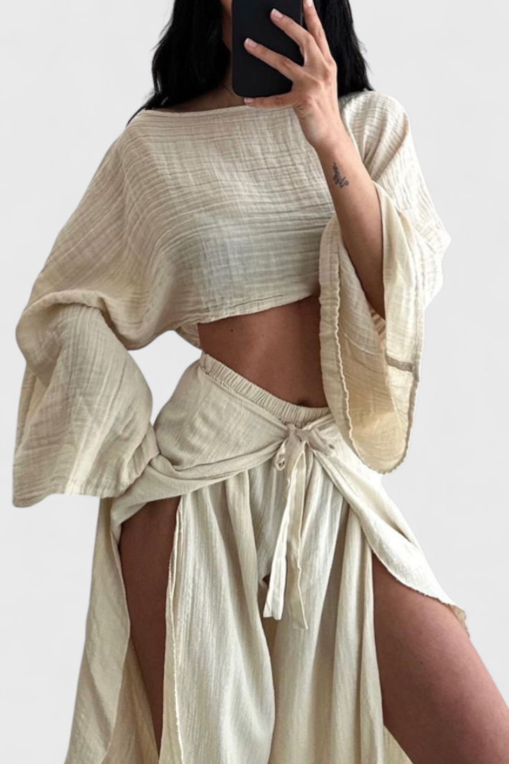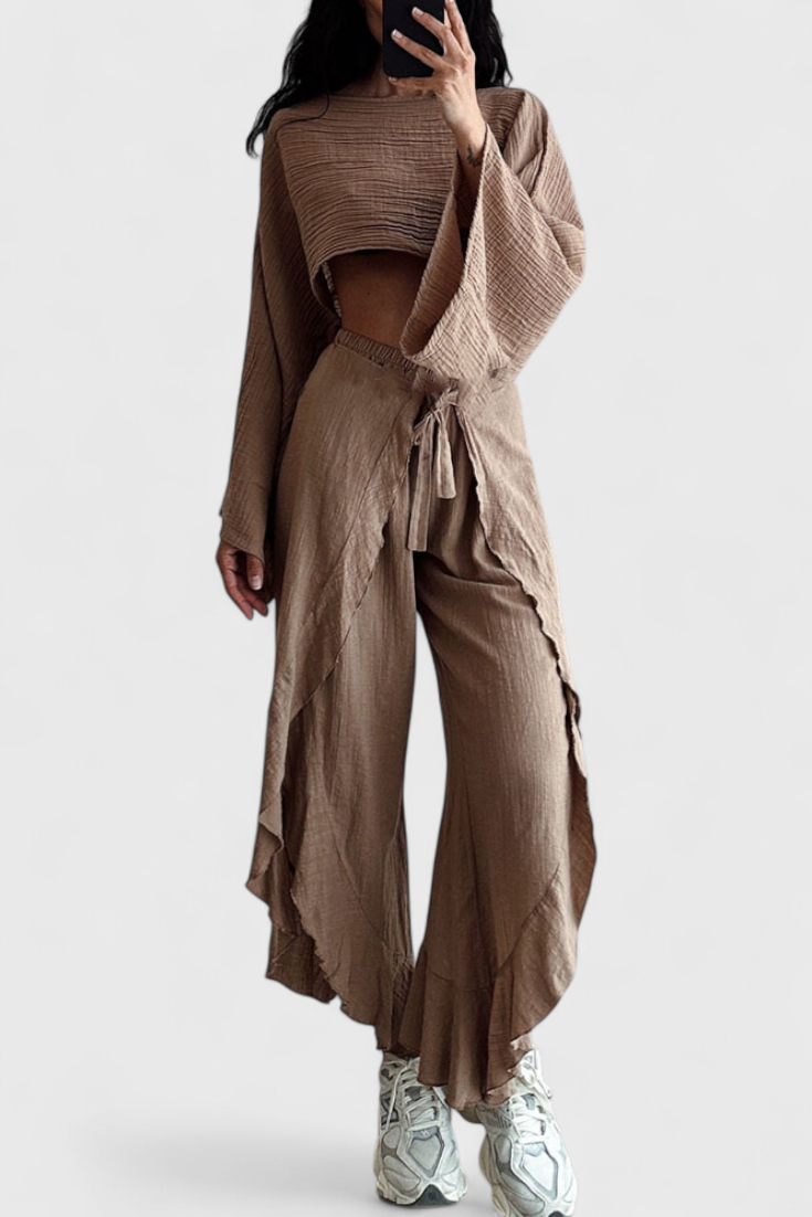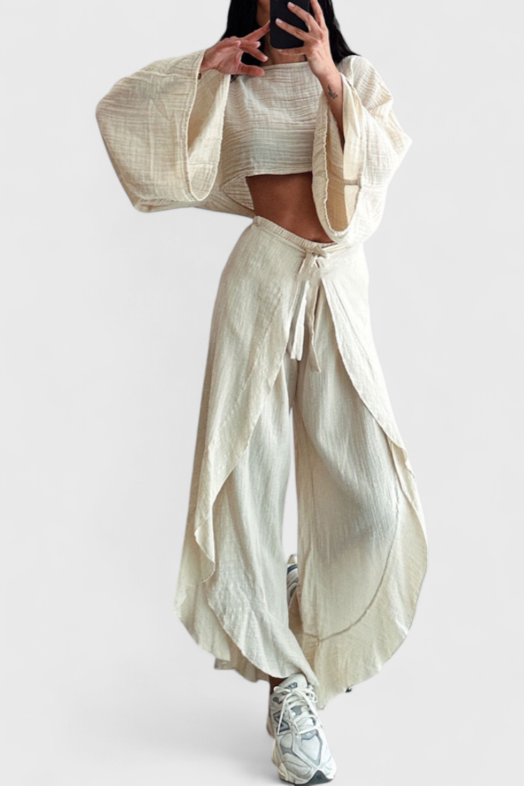 Patogumas su drąsiu akcentu. Maeva komplektas sujungia trumpą, laisvą viršų su šonine iškirpte ir plaukiančias aukšto liemens kelnes su juostele juosmenyje, siūlydamas modernią ir universalų siluetą. Jo lengvas audinys ir minkštas kritimas daro jį idealiu pasirinkimu stilingoms atsipalaidavusioms dienoms.