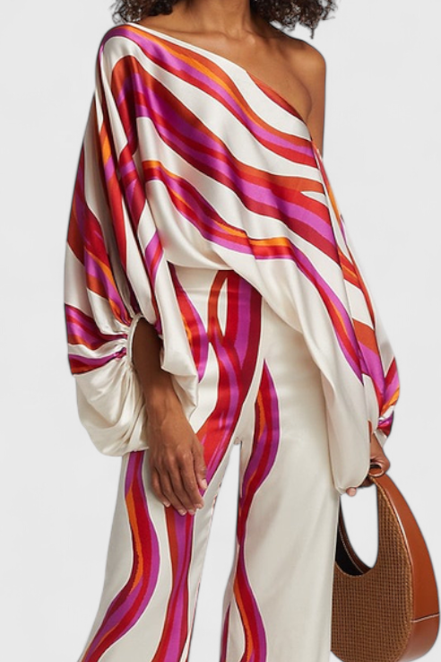 Sybella komplektas sujungia bluzoną su atvirais petnešomis ir pūkuotomis rankovėmis su plačiomis kelnėmis su meniniu raštu. Sukurtas, kad užtikrintų sklandų siluetą su asmenybe, jis yra idealus saulėtoms dienoms, atsipalaidavimo akimirkoms ar stilingiems susitikimams.