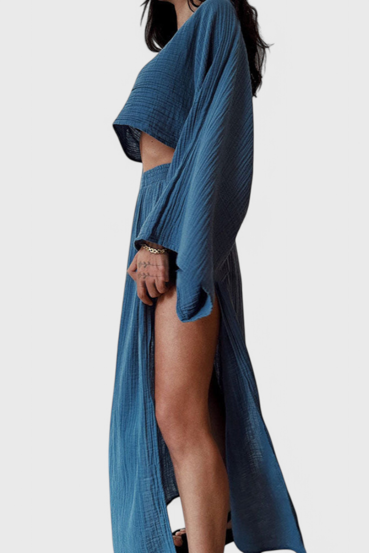 Lengvas, rafinuotas ir sukurtas palikti įspūdį—Martha komplektas sujungia modernų stilių su laisvu siluetu. Jo lengvas trumpas topas ir sijonas su šoniniu įpjovimu sukuria tobulą pusiausvyrą tarp elegancijos ir gaivumo, puikiai tinkantis saulėtoms dienoms ar ypatingoms naktims.