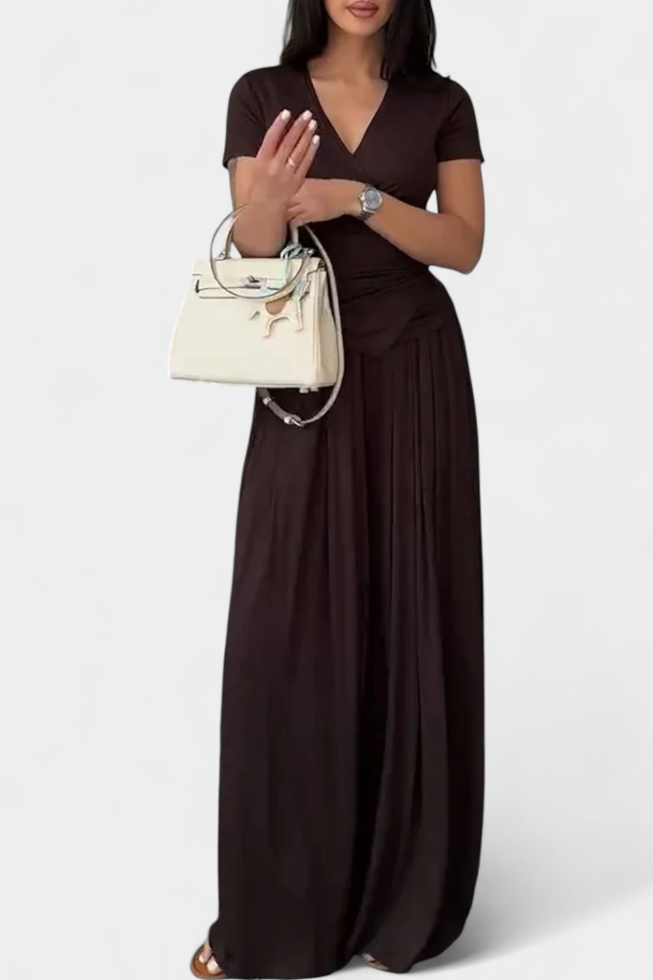 Modernus komfortas su moteriška aura. Ruslana komplektas sujungia švelnumą ir stilių atsipalaidavusio silueto, kuris prisitaiko prie bet kokio ritmo. Jos kryžminis viršus natūraliai pabrėžia figūrą, o plačios kelnės laisvai plūsta, sukurdamos idealų įvaizdį, kad su malonumu judėtumėte bet kuriame neformaliame renginyje.