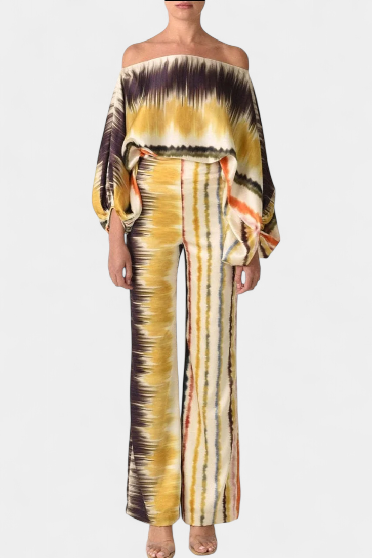 Sybella komplektas sujungia bluzoną su atvirais pečiais ir pūkuotomis rankovėmis su plačiomis kelnėmis ir meniniu raštu. Sukurtas užtikrinti sklandų siluetą su asmenybe, jis idealiai tinka saulėtoms dienoms, atsipalaidavusioms išvykoms ar stilingiems susitikimams.