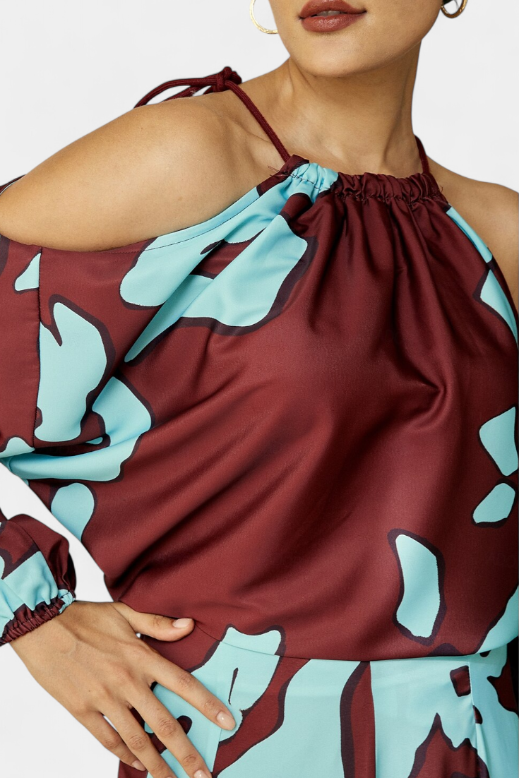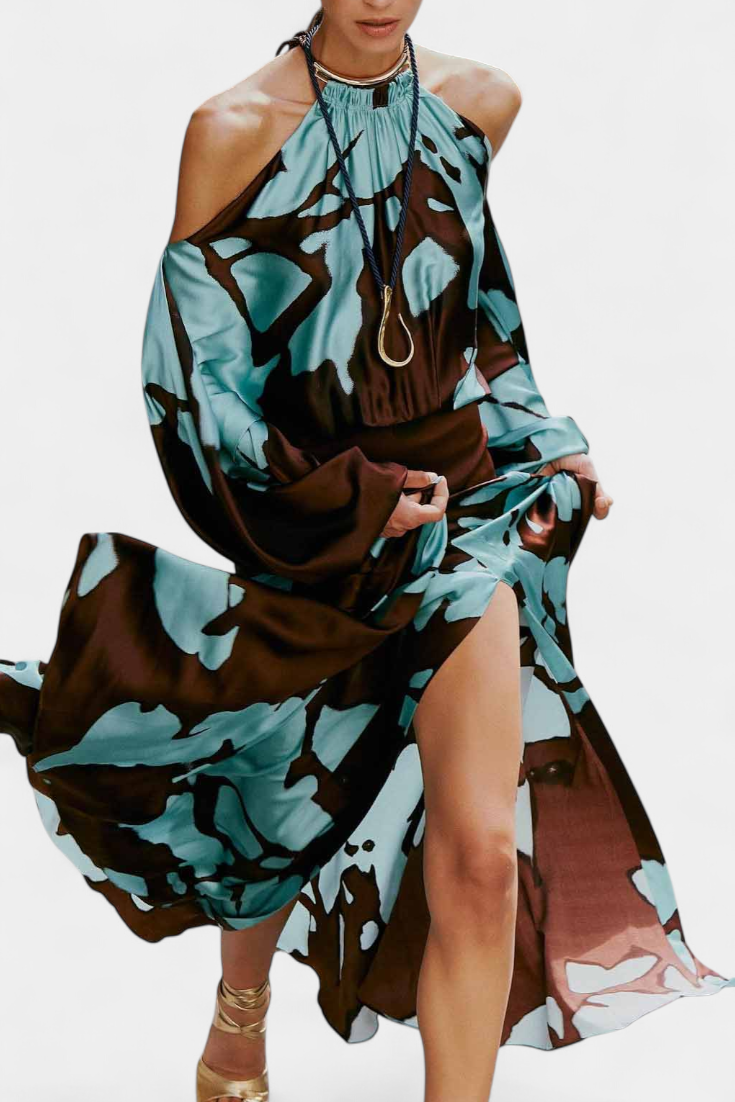 Eterinė elegancija su šiuolaikiniu prisilietimu. Suknelė Monte išsiskiria lengvu siluetu, atviro tipo rankovėmis ir abstrakčiu raštu kontrastingomis spalvomis, kurios sugauti šviesą su kiekvienu judesiu. Jos iškirptė su metaliniu akcentu ir prigludusi juosta formuoja stilizuotą figūrą su charakteriu ir rafinuotumu.