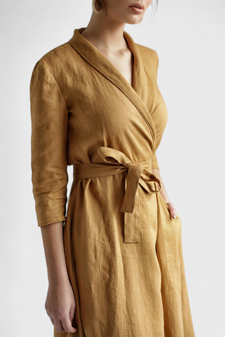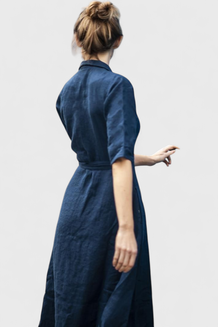 Klasikinė elegancija su amžinu priedu. Suknelė Sharon išsiskiria apglėbiančiu dizainu, atlenkiama apykakle, ilgomis rankovėmis ir midi siluetu, kuris natūraliai pabrėžia figūrą. Pagaminta iš medvilnės ir lino mišinio, ji siūlo lengvą ir struktūrizuotą jausmą, idealiai tinkantį pereinamajam sezonui.